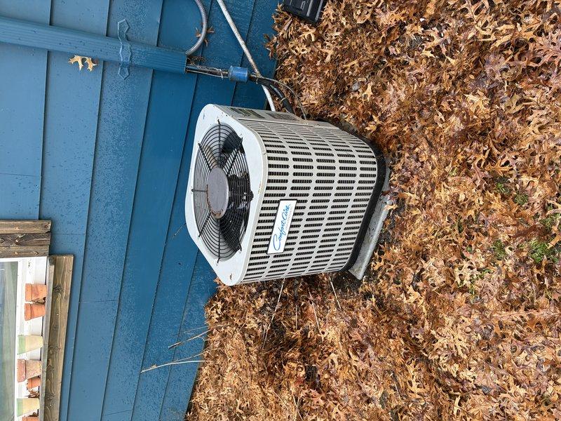 Performed routine maintenance inspection on residential outdoor AC condenser unit mounted on concrete pad adjacent to customer's property. Unit appears to be in standard working condition with proper installation of copper lines and electrical connections. Cleared accumulated autumn debris from around the unit to ensure proper airflow and system efficiency.