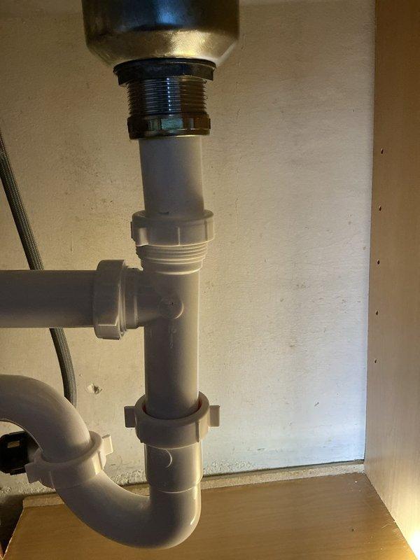 Responded to emergency service call for kitchen sink drain leak. Discovered disconnected PVC P-trap assembly causing water to leak onto cabinet floor. Installed new PVC trap assembly with proper compression fittings, ensuring secure connections to existing metal drain fixture. Tested system for leaks and confirmed proper drainage function.