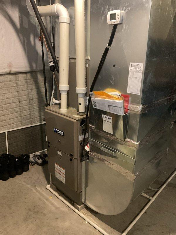 Diagnosed failed squirrel cage in York furnace system; documented issue with photos and ordered warranty replacement parts. Will return to complete installation once parts arrive at shop.