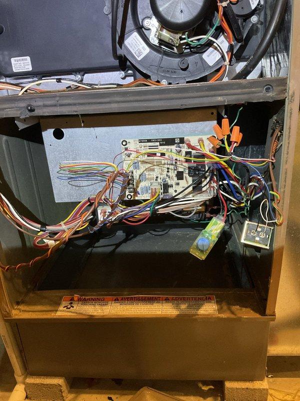 Diagnosed 9-year-old gas furnace with no heat issue where blower was operational but heating would not engage. Upon inspection of control board and electrical connections, identified fault in ignition sequence and repaired connection issue to restore proper heating function. Unit now operating according to manufacturer specifications.